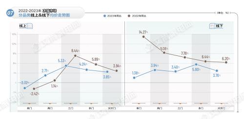2023年国内冰箱市场线上线下均价上扬,但是,各细分品类价格表现不一。容积段低的产品价格变动并不大,大容积段的多门、对开门冰箱价格涨幅略高。(见图6、图7)