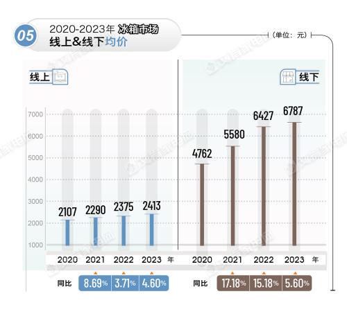 用户需求升级、企业优化产品结构,供需两端的契合,这些在冰箱均价上发挥出了积极的作用。2023年国内冰箱市场线上线下均价都呈现出了积极的走势。