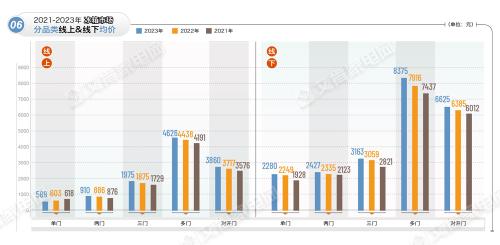 单门冰箱在线上平台价格竞争激烈,是2023年线上唯一均价下滑的品类,2023年均价已经跌至600元以下,为589元,同比下滑2.32%。线下市场中,单门冰箱针对高品质单身、年轻群体,功能、外观更为讲究,因此,2023年均价有1.38%的略微增长,均价为2280元。