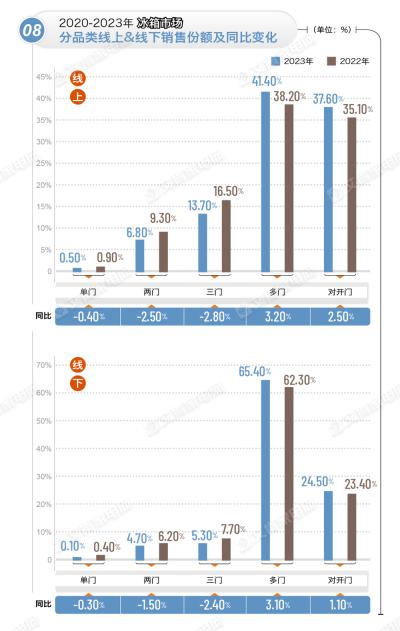 由此可以看出,用户需求的升级是线上线下并行的。以保鲜、净味、保湿、杀菌等基本需求为核心,审美需求、家庭人口、居住环境、食材宽度等的变化或升级,用户对冰箱的容量、形态、功能的要求也在持续进化。因此2023年,多门、对开门冰箱无论是线上还是线上市场销售份额均有增长。多门冰箱线上市场份额同比增加3.2个百分点,占比达41.4%;线下市场份额同比增加3.1个百分点,占比为65.4%。对开门冰箱销售份额增幅相对较小,线上市场份额为37.6%,同比增加2.5个百分点;线下市场份额为24.5%,同比微增1.1个百分点。