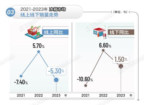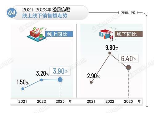 细分线上线下市场的冰箱销量销售额走势,2023年,国内冰箱市场线上销量同比减少5.3%,销售额提升3.9%;线下销量同比增长1.5%,销售额增幅较大,达到6.4%。(见图3、图4)