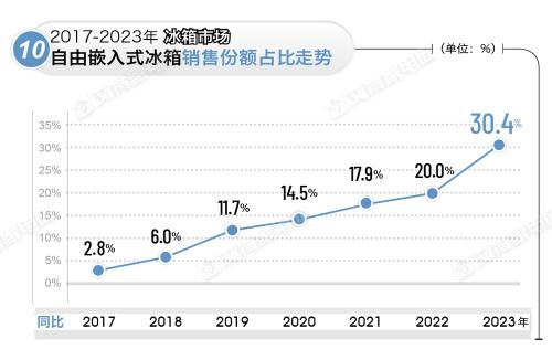 2023年国内冰箱市场嵌入式冰箱销售份额实现大幅增长,达到30.4%,同比上一年增长10.4个百分点,是七年来增幅最大的一年。(见图10)