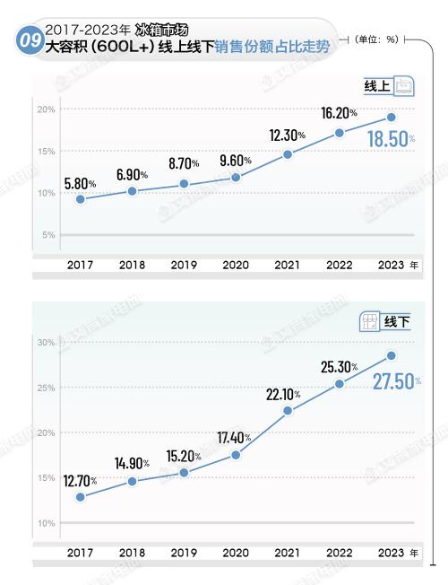 2023年,600L以上大容积冰箱国内市场销售份额占比在线上线下同步提升,占比分别为18.5%和27.5%。(见图9)