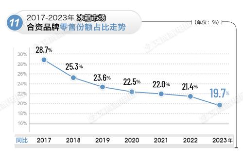 对于冰箱行业品牌格局来说,强者恒强的态势难以更改。中小品牌在中低端产品领域扩大销售规模的同时,也在大容积、超薄、嵌入式品类作出探索。反观外资品牌,受到产品结构、企业内部决策周期等影响,产品线结构切换较为缓慢,外资品牌整体在压力中前行。(见图11)