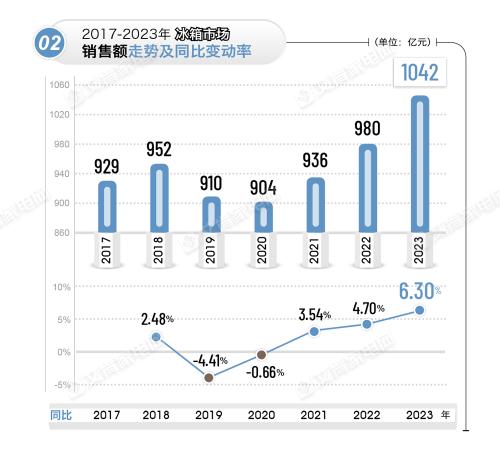 相比于销售规模的小幅下滑,2023年,国内冰箱市场销售额呈现较大幅度的增长。2023年,国内冰箱市场销售额1042亿元,同比增长6.3%,这一增幅超过2021年与2022年销售额的增长幅度。(见图2)