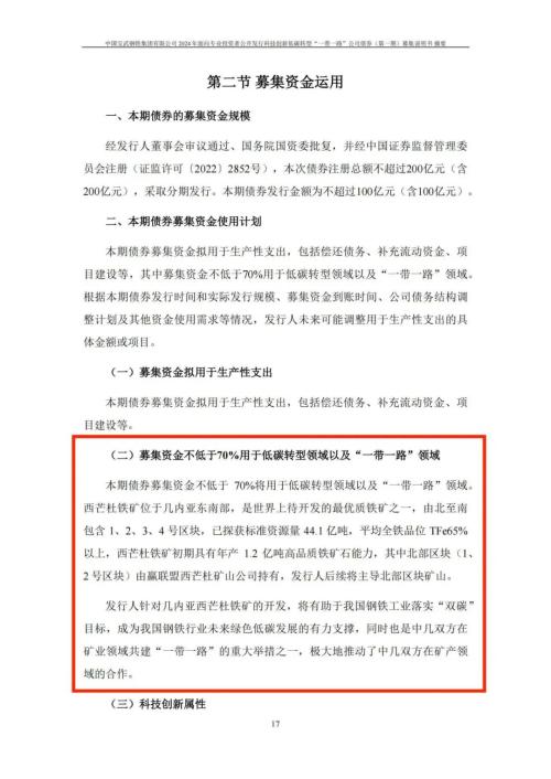 募集说明书摘要指出,发行人针对几内亚西芒杜铁矿北部区块的开发,将有助于我国钢铁工业落实“双碳”目标,成为我国钢铁行业未来绿色低碳发展的有力支撑。说明书还对西芒杜铁矿涉及的低碳转型技术进行了阐述。