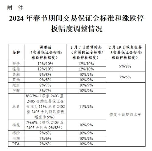 一、自2024年2月7日结算时起,白糖、棉花、棉纱、菜粕、菜油、PTA、短纤和甲醇期货合约的交易保证金标准为10%,涨跌停板幅度为9%;尿素期货合约的交易保证金标准为11%,涨跌停板幅度为9%。