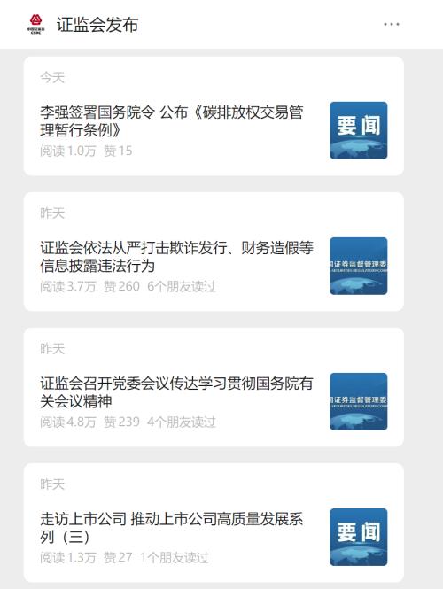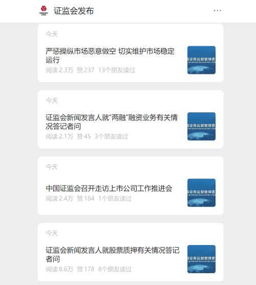 最近两日,证监会官方微信公众号连续发布10条推文,涉及的方面包括严惩操纵市场恶意做空、“两融”融资业务有关情况、股票质押有关情况、依法从严打击欺诈发行、财务造假等信息披露违法行为等。