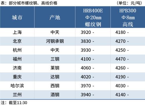 ◎北京:7日早盘建材市场价格平稳,现河钢、敬业HRB400E螺纹Ф12mm3890、Ф20mm3830,HRB400E盘螺Ф10mm3970。(单位:元/吨)