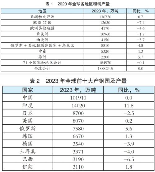 根据世界钢铁协会的统计数据,2023年全球粗钢产量合计18.882亿吨,同比基本持平。全球71个纳入该机构统计的国家和地区粗钢产量合计为18.497亿吨,同比微降0.1%。分地区来看,欧洲、北美和南美粗钢产量同比下降,其他地区产量同比增加;分国家来看,全球前十大产钢国中,日本、德国、土耳其、巴西粗钢产量同比下降,其他国家同比增加,尤其是印度产量增幅达到11.8%。