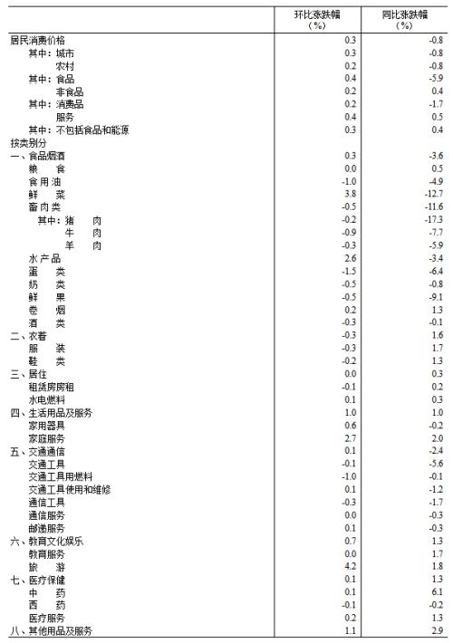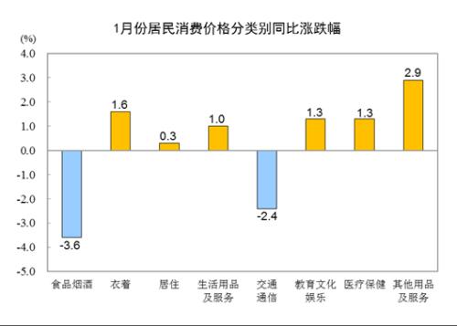 1月份,受上年同期春节错月高基数影响,全国居民消费价格同比下降0.8%。其中,城市下降0.8%,农村下降0.8%;食品价格下降5.9%,非食品价格上涨0.4%;消费品价格下降1.7%,服务价格上涨0.5%。在1月份-0.8%的CPI(居民消费价格指数)同比变动中,翘尾影响约为-1.1个百分点;今年价格变动的新影响约为0.3个百分点。