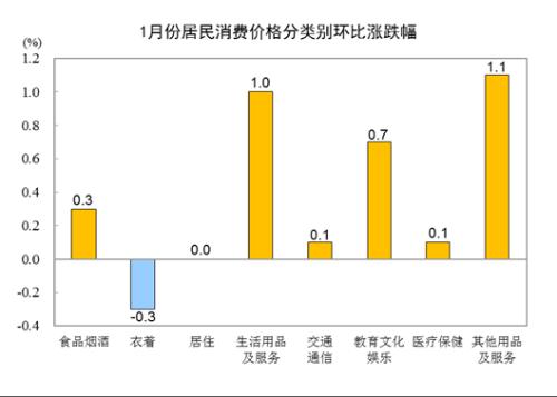 1月份,食品烟酒类价格环比上涨0.3%,影响CPI上涨约0.09个百分点。食品中,寒潮天气加之春节临近消费需求增加,鲜菜价格上涨3.8%,影响CPI上涨约0.08个百分点;水产品价格上涨2.6%,影响CPI上涨约0.05个百分点。各地积极加大民生商品供应,蛋类价格下降1.5%,影响CPI下降约0.01个百分点;鲜果价格下降0.5%,影响CPI下降约0.01个百分点;畜肉类价格下降0.5%,影响CPI下降约0.01个百分点。