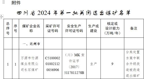 根据《中共中央办公厅国务院办公厅关于进一步加强矿山安全生产工作的意见》和《国家发展和改革委员会办公厅国家能源局综合司关于进一步优化完善产能置换政策的通知》(发改办运行〔2022〕851号)要求,经煤矿企业申请和万源市人民政府研究决定,达州市安全生产委员会办公室申报,确定全省2024年第一批关闭退出煤矿名单,现予以公示,接受社会监督。