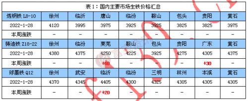 本周生铁市场稳中个别上涨,成交一般。本周初山东、河北地区个别铁厂低价资源报价向高位靠拢。炼钢铁方面,资源依然偏紧,铁厂多按单排产发货,个别钢厂虽有采购意向,但市场低价资源难寻,整体交投气氛一般;铸球铁方面,铸造厂、贸易商多停工放假,市场成交稀少,个别铁厂停产或计划停产,资源供应压力小,高成本、低库存支撑下,铁厂调价意愿不高。目前各地铁厂库存不大,不少铁厂仍排产前期订单,据悉有铁厂订单已排至2月底,商家挺价心态强。各地生铁价格如表1。