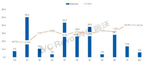 INX(群创):出货36.3M,同比下滑1.1%;出货面积16.1MO,同比微增0.4%。得益于头部品牌订单转移,主要尺寸43、50寸出货量同比大幅增长,其余尺寸均呈现不同程度的下降。