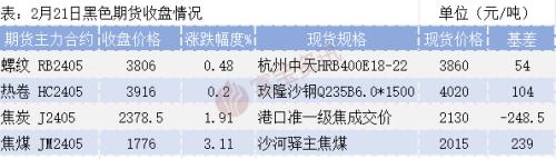 2.钢坯:2月22日唐山中拓物流钢坯仓储库存;昨入库0.47万吨,出库0.33万吨,现库存11.56万吨,较昨增加0.14万吨。2月22日唐山象屿正丰钢坯仓储库存;昨入库0.2万吨,出库0.4万吨,现库存27.15万吨,较昨减少0.2万吨。3.焦炭:焦企亏损范围扩大,生产积极性较差,且在利润影响下仍有部分焦企保持限产状态,然下游钢厂复产动作缓慢,对焦炭刚需一般,影响焦企焦炭库存有所累积,焦炭供需结构延续宽松运行。需求方面,终端需求表现依然偏弱,钢厂盈利能力欠佳,对焦炭采购仍保持谨慎态度,多按需采购为主。港口方面,港口焦炭现货暂稳运行,贸易商多持观望态度,市场成交清淡,活跃度较低。预计短期内焦炭市场稳中偏弱运行。4.产业信息:中天钢铁于2月19日-25日对1座转炉进行例行检修,为期6天,预计影响当月产量4万吨左右。三、今日动态【夜盘收盘一览】