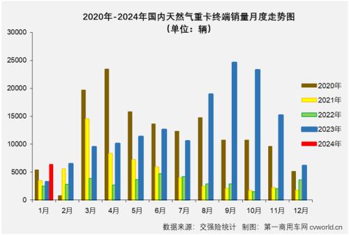 由最近五年国内天然气重卡终端销量月度走势图可见,代表2024年的红色柱体比之前任何一年的1月份都“高”出一截,如果仅看1月份销量,2024年天然气重卡市场是以五年最佳的表现开局,可以说是开了一个好头。但客观地看,今年1月份天然气重卡市场收获大增,很大程度上还是得益于同期较低的销量,今年1月份所处高度放在2023年里仅排倒数第三(仅高于当年1月份和12月份),放在2020里看也处于低位水平(仅高于当年1月、2月和12月,如上图)。实际上,包括天然气重卡在内,国内重卡市场在2023年年末已明显降温(12月份重卡实销仅3.61万辆),进入2024年,重卡终端需求进一步放缓,1月份重卡实销仅3.39万辆,在整体需求有限的市场大环境下,天然气重卡销量很难持续处于高位,同步降温也是情理之中。