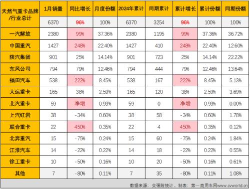 根据第一商用车网掌握的终端销量数据(交强险口径,不含出口和军品),2024年1月份,国内天然气重卡实销6370辆,环比去年12月增长4%,同比也继续实现增长,增幅达到96%,同比增速较上月扩大25个百分点(2023年12月销量同比增长71%),至此,天然气重卡市场本轮自2022年12月开始的增长成功扩大至“14连增”。