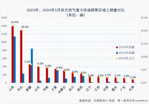 从终端销售区域来看,2024年1月,全国共有30个省(市、自治区)有天然气重卡挂牌上路(去年同期仅有24省),区域分布仍呈现出极不均衡的状态,山西、河北等资源型物流运输大省,“接收”了今年1月份天然气重卡终端市场大部分销量(如下图),1月份终端区域销量前两位的山西和河北占比均超20%,分别达到21.9%和20.3%,今年1月份山西和河北分别有1395辆和1295辆天然气重卡挂牌上路;新疆、山东、河南和宁夏分列上牌量第3-6位,1月份分别有456辆、404辆、374辆和344辆天然气重卡挂牌,占比分别为7.2%、6.3%、5.9%和5.4%;排名区域上牌量第7、8位的内蒙古和四川今年1月份天然气重卡的上牌量也超过200辆,占比均超3%。