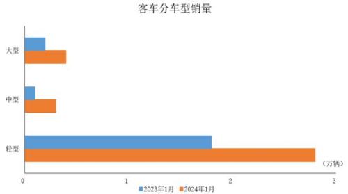 2024年1月,客车产销均完成3.5万辆,环比分别下降35.3%和36.5%,同比分别增长68.1%和63.4%。在客车细分品种中,与上月相比,三大类客车品种产销均呈两位数下降;与上年同期相比,三大类客车品种产销均呈不同程度增长。
