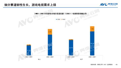 随着游戏、体育赛事等对高帧率内容的需求增加,高刷新率电视的市场也随之扩大。彩电企业为满足不同用户群体的需求,不断推出具有更高刷新率的产品。高刷技术的普及使得消费者对于高刷新率电视的认知逐渐提升,也逐渐成为消费者购买决策的重要因素之一。2024年开年阶段,120Hz及以上屏幕刷新率的产品零售量份额呈现全渠道增长趋势,对比去年同期,120Hz产品线上、线下市场零售量份额增长均超过10个百分点;144Hz产品线上、线下市场的零售量份额同样有超过5个百分点的增长。