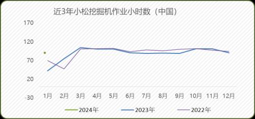 近日,小松官网公布了2024年1月小松挖掘机开工小时数数据。2024年1月,中国地区小松挖掘机开工小时数为80.4小时,同比增长89.0%。在低基数的基础上,下游施工是否回暖,尚有待进一步观察。