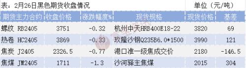 2.钢坯:2月27日唐山中拓物流钢坯仓储库存;昨入库0.24万吨,出库0.48万吨,现库存13.32万吨,较昨减少0.24万吨。2月27日唐山钢联鹏利钢坯仓储库存;昨入库0万吨,出库0.38万吨,现库存1.58万吨,较昨减少0.38万吨。3.焦炭:近期焦企利润不断被挤压,生产积极性一般,且受前期焦炭发运不畅以及下游钢厂需求偏弱影响,产地焦企厂内焦炭库存继续累积,虽有少数中间商入市询货,但整体去库仍较为缓慢,综合来看,终端消费暂无回暖迹象,钢材价格震荡下行,钢厂仍亏损严重,对焦炭多按需采购为主,虽有少数贸易商进场拿货,但市场整体需求仍显一般,多数焦企库存仍有明显堆积,钢厂对焦价打压意愿仍较为强烈,预计短期内焦炭市场或继续偏弱运行。4.铁矿石:2月19日-25日,中国47港铁矿石到港总量2118.8万吨,环比减少458.5万吨;中国45港铁矿石到港总量2030.6万吨,环比减少497.9万吨。5.产业信息:广东中南钢铁股份有限公司6号高炉计划自2月26日至4月2日停炉大修,预计影响日均铁水产量0.35万吨。此外,线盘轧线在此期间轮流停产待料。三、今日动态【夜盘收盘一览】