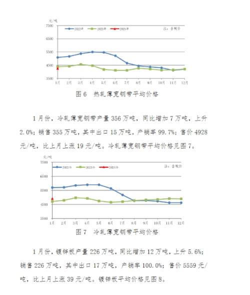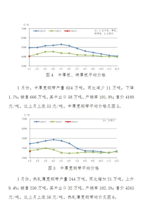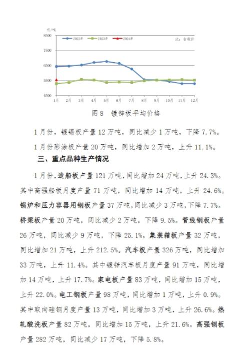 1月份,重点统计企业板带材产量同比上升,其中中厚板轧机、冷连轧机产量同比、环比均有所上升,热连轧机产量同比上升,环比下降。主要品种板中集装箱板产量同比大幅增加,造船板和家电板产量保持较快增长,管线钢板、锅炉容器板和桥梁板同比降幅较大。中厚板和冷轧产品价格由降转升,热轧产品价格继续小幅回升。