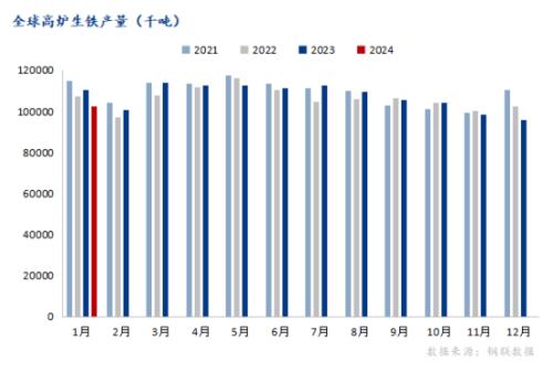 根据世界钢铁协会公布的最新统计数据显示,2024年1月份全球高炉生铁总产量较2023年12月份相比均小幅增加,全球直接还原铁产量较2023年12月份相比均小幅减少。