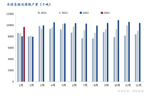 统计数据显示,2024年1月份,全球40个主要生铁生产国共产生铁102668千吨,与去年同期相比减少1.38%。全球直接还原铁产量为9661千吨,与去年同期同比增加19.67%。