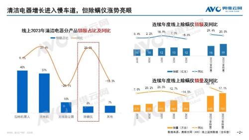 消费者对家居环境关注度的日益提高,使得清洁电器逐渐成为家电市场的新宠,但近两年增速有所放缓。而除螨仪作为一种主要用于床品清洁的清洁电器,尽管当前体量较小,热度却居高不下。奥维云网(AVC)线上监测数据显示,2023年除螨仪线上零售额规模为19亿元,同比增长20.0%;线上零售量规模为755万台,同比增长17.1%。
