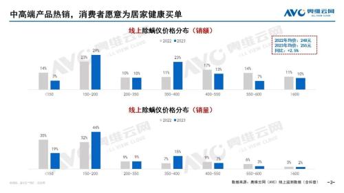 目前,除螨仪市场上热销的产品价格相对较高。奥维云网(AVC)线上监测数据显示,2023年除螨仪行业均价为255元,同比增长2.5%。从价格分布来看,150-200价格段销额占比为29%,是第一大价格段;其次是350-400价格段,销额占比为23%。较高价位段产品的热销意味着消费者愿意为健康付费买单,同时也意味着品牌能够获得较大的利润。