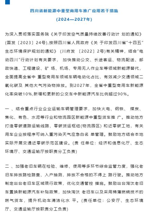 3月1日,四川省经济和信息化厅、四川省公安厅、四川省生态环境厅、四川省交通运输厅等四部门联合印发《四川省新能源中重型商用车推广应用若干措施(2024—2027年)》(以下简称《若干措施》),加快推动全省中重型商用车新能源化。
