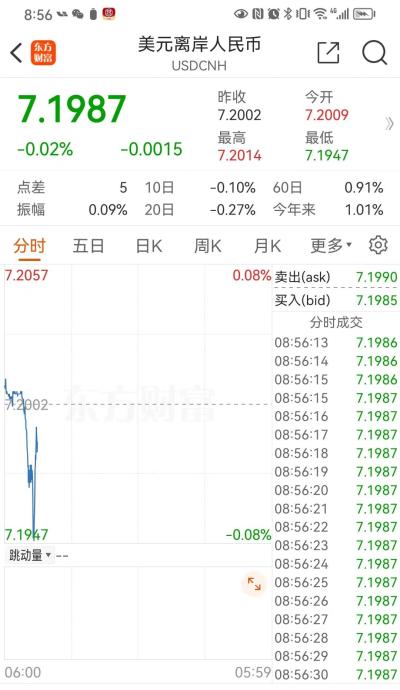 京时间3月8日05:59,离岸人民币(CNH)兑美元明显上涨,盘中整体交投于7.2130-7.2元区间,最高报7.2003元;06:06,离岸人民币涨穿7.2元关口,为2月23日以来首次,当时最高触及7.1999元。