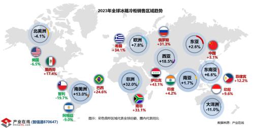 分洲别市场表现来看,受高通胀及经济放缓影响,居民生活成本压力飙升,进一步抑制了冰箱冷柜等耐用品的消费需求,2023年大洋洲及北美洲市场规模同比有所下滑,其中澳大利亚和美国作为主要消费市场,同比降幅分别为11.4%、6.5%。