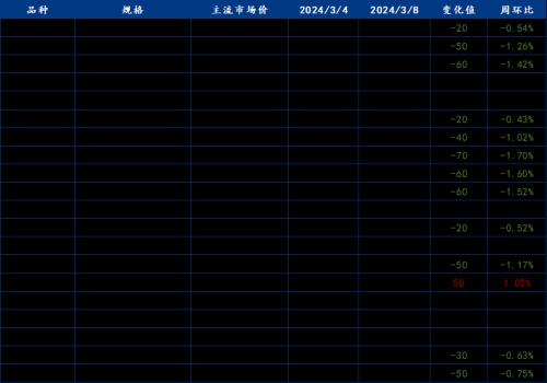 截止2024年3月8日,各原材料当日即时价格以及价格周环比情况如下: