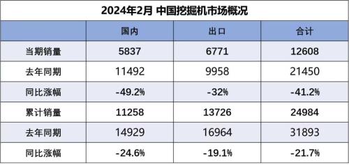 据中国工程机械工业协会对挖掘机主要制造企业统计,2024年2月销售各类挖掘机12608台,同比下降41.2%。其中,国内5837台,同比下降49.2%;出口6771台,同比下降32%。