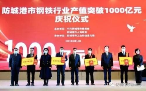 今年1月14日,防城港市委、市人民政府就举办过防城港市钢铁行业产值突破1000亿元庆祝仪式,宣布2021年该市钢铁全行业产值实现1075.2亿元。钢铁成为该市首个产值突破千亿元的支柱产业,防城港市也由此成为广西壮族自治区第二个拥有单个千亿级行业的地级市。中共防城港市委书记谭丕创还在当天的庆祝仪式上提出了“1+1+4”的防城港钢铁产业发展目标(“1”是第一个1000亿,“1”是还要进军一个1000亿,“4”是将用“十四五”期间剩余的4年时间再造1000个亿)。