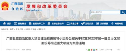 2月7日,广西壮族自治区重大项目建设推进领导小组办公室印发2022年第一批自治区层面统筹推进重大项目方案。方案共涉及1996个项目,总投资37826.2亿元,年度计划投资4007.9亿元。其中,新开工项目190个,总投资3447.8亿元,年度计划投资282.8亿元;续建项目1066个,总投资22572.9亿元,年度计划投资3236.5亿元;竣工投产项目217个,总投资3146.5亿元,年度计划投资488.6亿元;预备项目523个,总投资8659亿元。