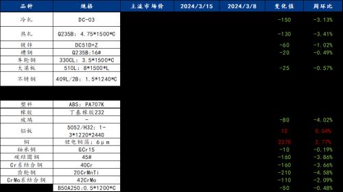 截止2024年3月15日,各原材料当日即时价格以及价格周环比情况如下: