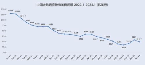 数据显示,中国所持美债规模暂停“两连涨”,当月减少186亿美元至7977亿美元。此前在2023年12月,中国的美债持仓量曾升至8163亿美元,不过目前仍连续21个月低于1万亿美元。据新华财经统计,2024年1月,中国所持美债规模同比缩减617亿美元。