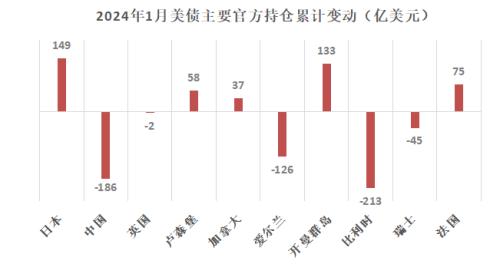 从地区分布来看,美国财政部仅公布持有美债的前20位海外官方投资者持仓数据,2024年1月份,有11个国家和地区持有美债规模环比下降,占比达到55%。目前美债的海外持仓中,47.24%为各国/地区官方持有,而在官方持仓配比方面,中长期美债占比93.39%。