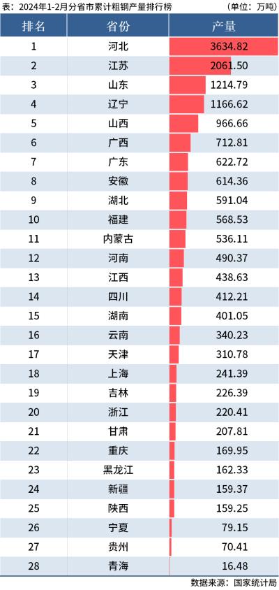国家统计局数据显示,2024年1-2月中国粗钢产量16796万吨,同比增长1.6%。其中,产量排名前二的省份是河北和江苏。具体情况如下: