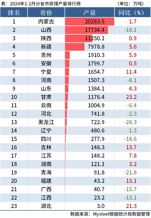 国家统计局数据显示,2024年1-2月,中国原煤产量为70526.7万吨,同比下降4.2%。其中,内蒙古原煤产量同比增长1.7%。