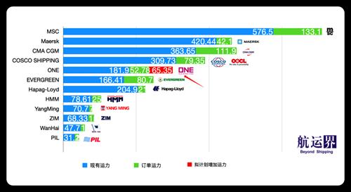 根据Alphaliner最新数据,在全球班轮公司运力100强中,ONE目前排名第6,运营232艘,其中自有船舶92艘、租入船舶140艘,总舱位达到181.9万TEU。此外,ONE还持有42艘,总计52.8万TEU新造船订单。