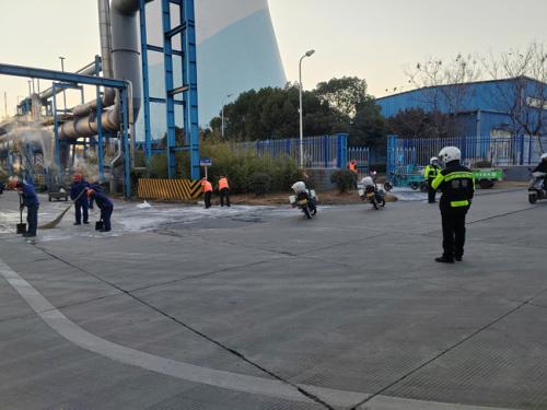 1月23日凌晨6时许,马钢北区二厂西路交叉路口由于冷却塔上冻水溢流淌,造成路面大面积结冰,致使该路段形成较大的交通安全隐患,马钢保卫部交管巡逻大队紧急抽调队员对现场进行安全管控,指挥过往行人、电瓶车及货运车辆缓慢通行,至7时30分,在交巡队员与该厂作业人员和现场环卫工人一同铲除结冰、撒盐消融后恢复正常通行。(记者章利军/文通讯员张新勇/摄)