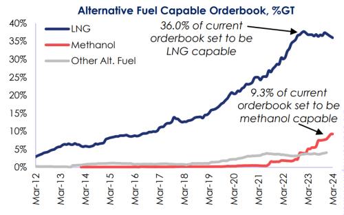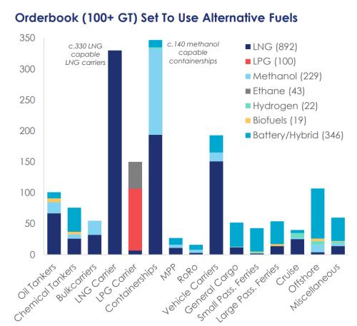 而在手持订单中,替代燃料船舶占比更是达到了49.8%,高于2017年的10.9%和2022年初的33.9%。按吨位计算,手持订单中36%为LNG动力船(892艘),9.3%为甲醇动力船(229艘),2.0%为LPG动力船(100艘);此外还有约2.5%(约348艘)使用其他替代燃料,其中包括22艘氢燃料、43艘乙烷燃料、11艘氨燃料、19艘生物燃料和346艘电池/混合动力推进船舶,替代燃料船舶手持订单总计1569艘。