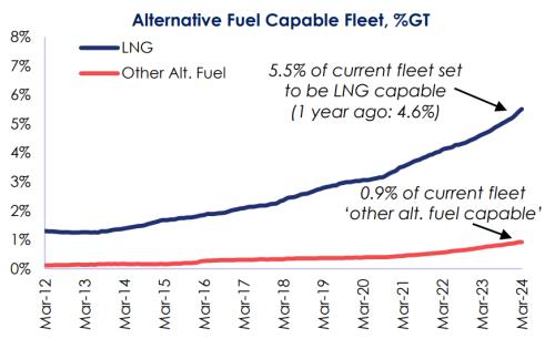 根据克拉克森的数据,整体而言按吨位计算,截至目前在运营船队中能够使用替代燃料或推进装置船舶的比例已经提高到了6.4%,高于2017年的2.4%和2022年年初的4.6%。在现有总计1760艘替代燃料船舶中,包括1070艘LNG动力船(约550艘为LNG动力LNG运输船)、29艘甲醇动力船、114艘LPG动力船、506艘电池/混合动力推进船,此外还有150艘采用其他燃料。