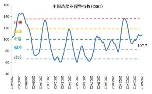 在上述指标综合影响下,2024年2月中国造船业景气先行指数为110.5,环比上升2.1点;中国造船业景气同步指数为99.7,环比下降0.9点;中国造船业预警指数为107.7,环比上升0.4点。中国造船业预警指数位于“正常”区间。