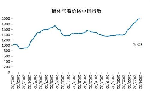 2023年11月,新造船价格中国指数为1461点,环比上升5点,其中,散货船、集装箱船、油船、液化气船的新造船价格中国指数分别为1675点、1155点、1674点、1999点,环比分别上升7点、1点、9点、7点。